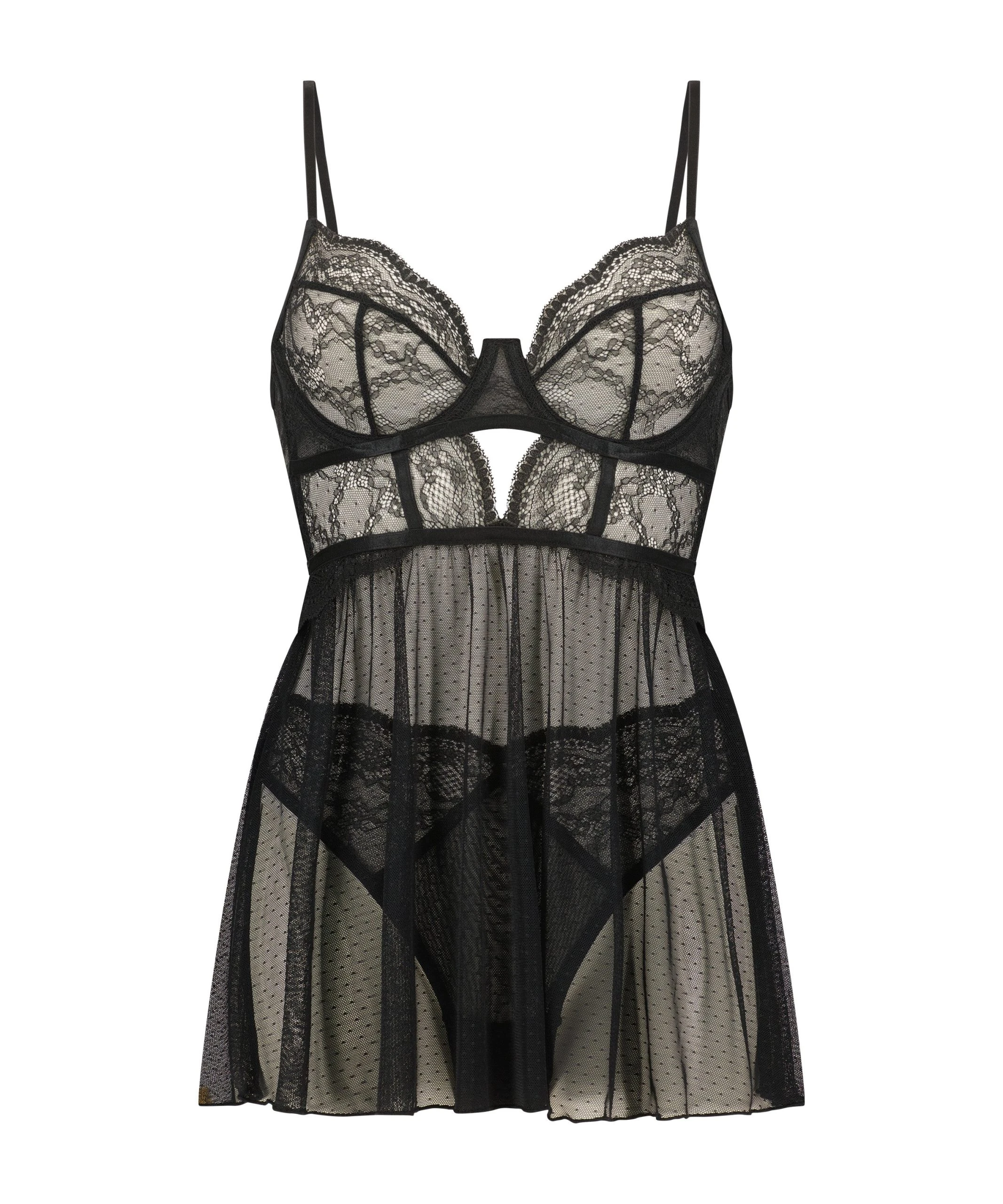 Fühle dich sexy in diesem umwerfenden Babydoll! Mit romantischen Allover-Spitzen-Look und Stäbchen im Vorder- und Rückenbereich für einen optimalen Halt, sowie Bügel-Cups. Ohne die dazu passenden Brazilian-Slips im Set zu vergessen!